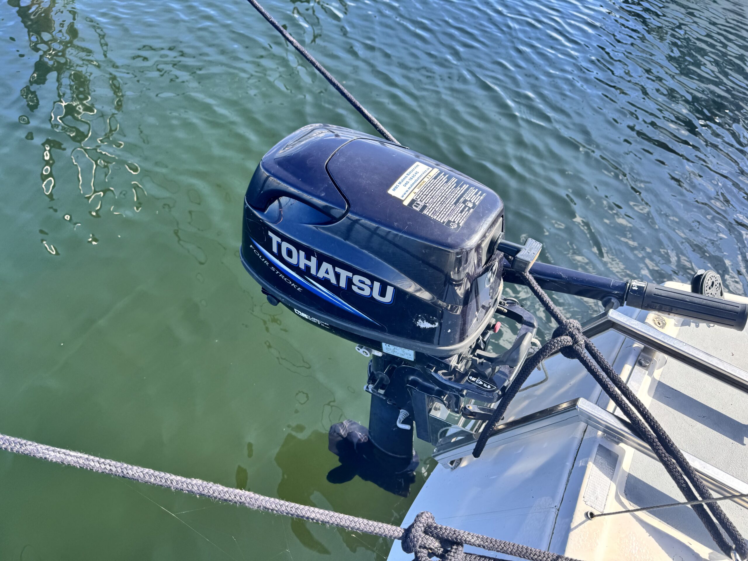 Motor: Tohatsu 5 hk, 4-takt, lång rigg. Monterad på räls i aktern.