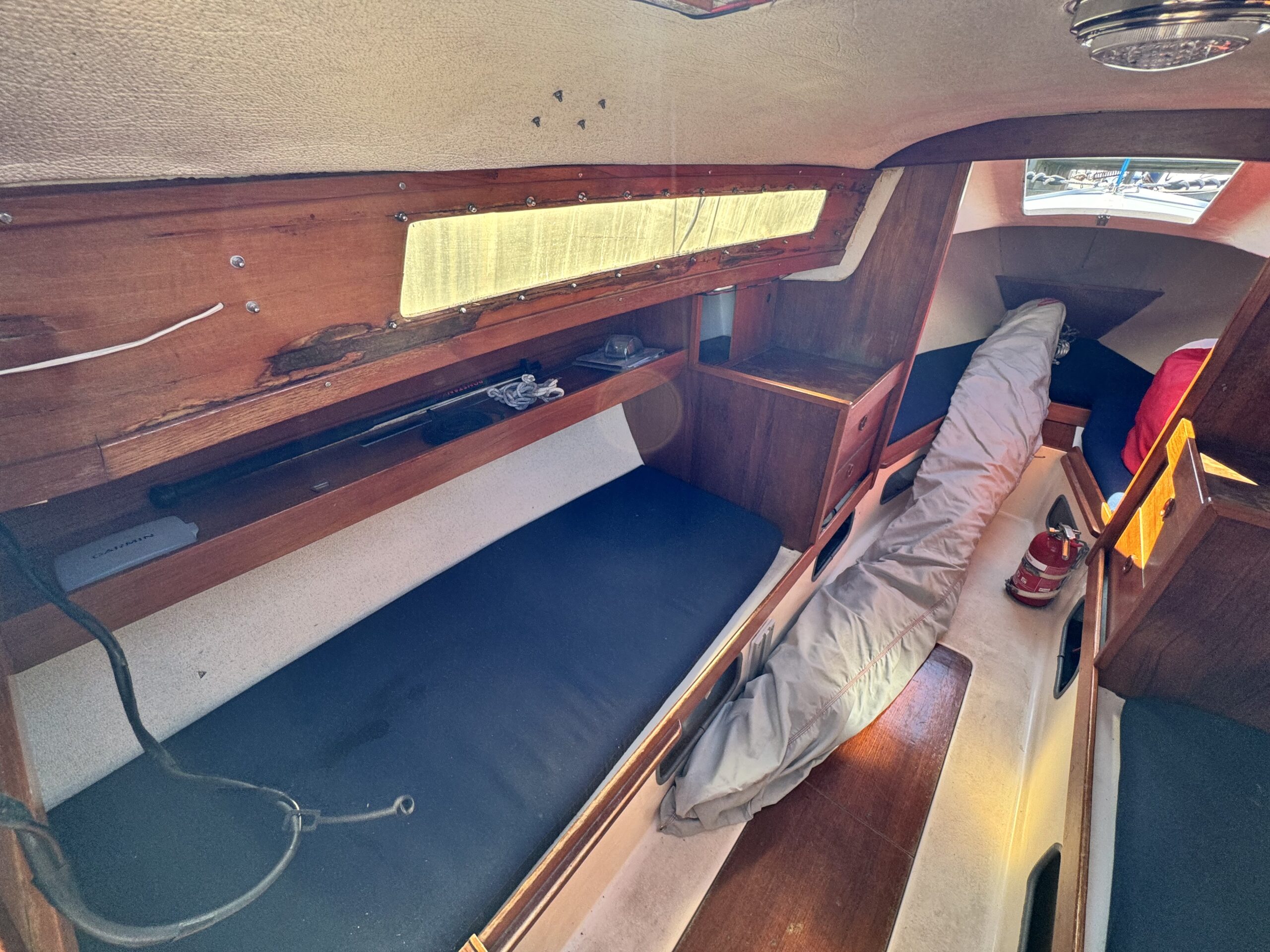 Inredning & komfort: Marinblå dynor, bord med stativ (salong/sittbrunn), extra dynor för sittbrunn, spritkök.